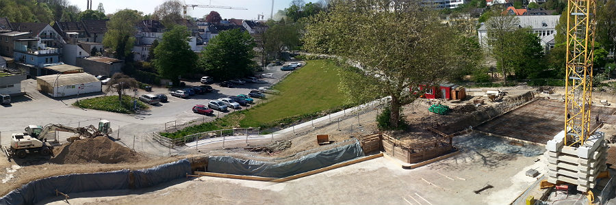 Der Rest-Parkplatz an der Buchmühle. Unten wird die Parkpalette gebaut.
