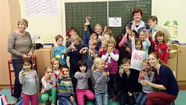 Dieses Jahr erhielt jedes Kind einen „Rüsselschnüffler“, den es sich selber aussuchen durfte. Anschließend wurde sofort damit gespielt. Nach einer kurzen Pause stellten sich dann aller Kinder samt Rektorin, Klassenlehrerin und zwei Damen vom Verein einem Gruppenfoto. Die Freude über dieses Geschenk, ist den Kindern anzusehen.