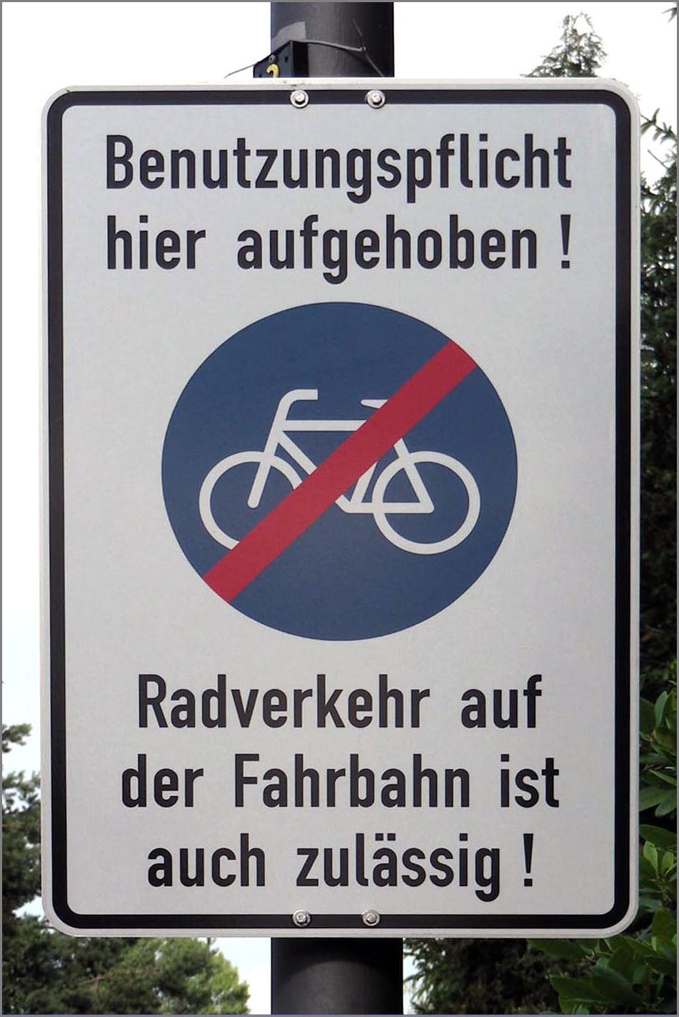 Auch außerhalb der Innenstadt ist die Stadtverwaltung rührend um Radfahrerinnen und Radfahrer besorgt. Weil einige Radwege (wenn es denn welche gibt) nicht ganz so optimal gepflegt sind, dürfen Radfahrerinnen und Radfahrer die Straße benutzen.