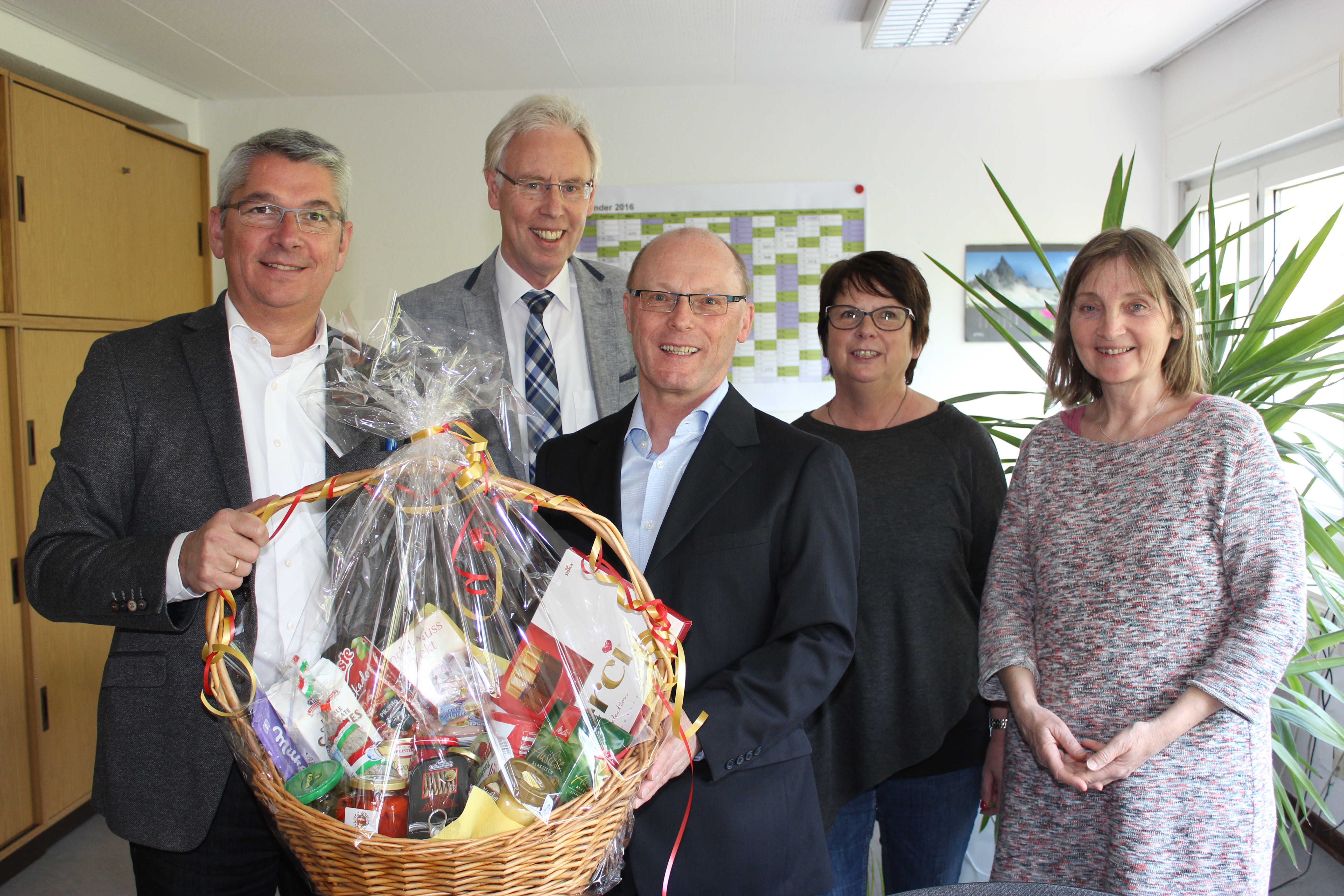 Bürgermeister Lutz Urbach und Fachbereichsleiter Peter Widdenhöfer gratulierten zum goldenen Jubiläum. „Ich muss gestehen, dass ich noch nie einen Kollegen hatte, der 50 Jahre Verwaltungsarbeit absolviert hat“, erklärte Bürgermeister Lutz Urbach. Mit einem (kleinen) Blumenstrauß und einem vielfältigen „Fresskorb“ bedankte sich der Verwaltungschef bei seinem Kollegen für jahrzehntelangen Einsatz im Sinne der Bürgerschaft.