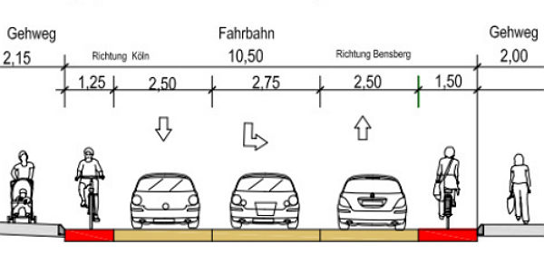 Ebenfalls mit der Mehrheit von CDU, SPD und Grünen wurde ein Radfahrstreifen auf der Kölner Straße (zwischen Graf-Adolf-Str. und Ferdinand-Stucker-Straße) in einer Breite von 1,85 Meter gebilligt. Der restliche Teil der Straße wird mit Radschutzstreifen ausgestattet, da hier weniger Platz zur Verfügung steht.