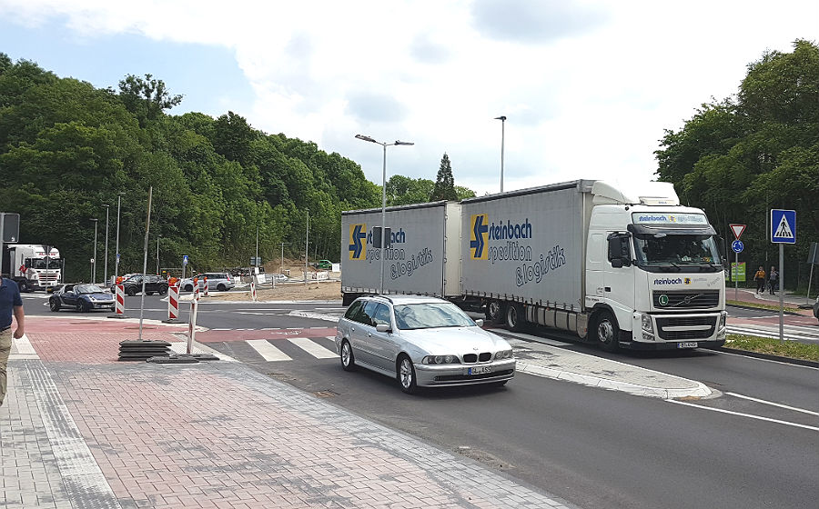 Zu Nummer 5: Es wird auf das “Merkblatt für die Anlage von Kreisverkehren” verwiesen. Da Bergisch Gladbach sich zur Testzone für innerstädtische Turbokreisverkehre bereit erklärt hat, scheint man die RAST06 ( Richtlinie für die Anlage von Stadtstraßen) vollkommen außer acht zu lassen. Dort auf Seite 57 steht geschrieben: ” Zweistreifige Kreiszufahrten sollen nur angewendet werden, wenn kein oder sehr wenig Fußgänger- und Radverkehr vorhanden ist, was in der Regel nur im Vorfeld bebauter Gebiete z.B. in Gewerbegebieten der Fall ist.” Frage. Sind wir (Radfahrer und Fußgänger” die Alphatester für die Unfallforschung und für die BAST?