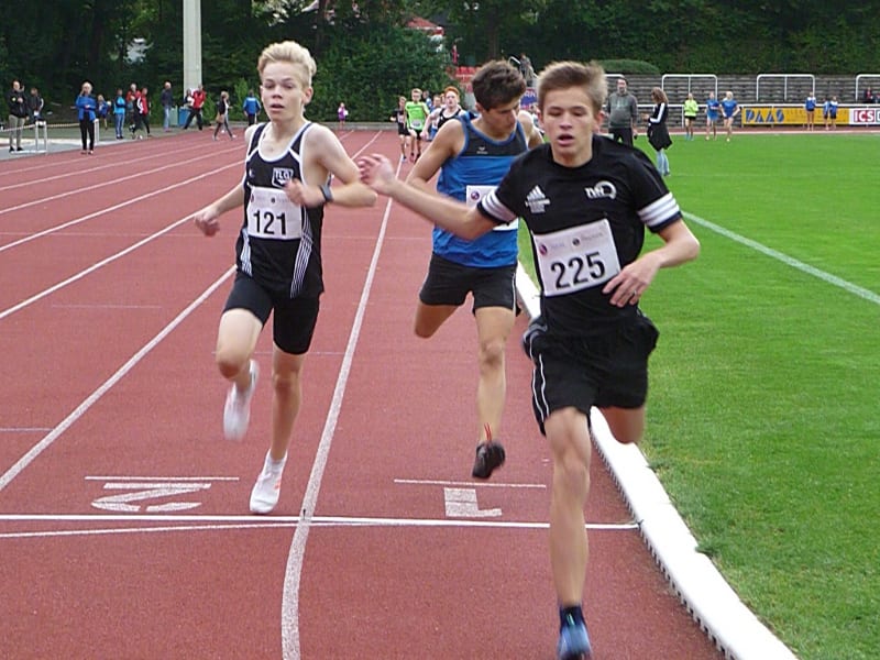 Zieleinlauf der U16 über 800m, Startnummer 225 ist der Sieger Roald Rösener (TV Herkenrath)
