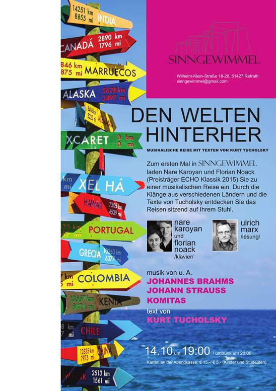 Die erste Veranstaltung von „Sinngewimmel” findet bereits am 14. Oktober um 19 Uhr statt: „Den Welten hinterher – eine musikalische Reise mit Texten von Kurt Tucholsky“. Karoyan und Noack spielen Stücke u.a. von Johannes Brahms und Johann Strauß. Die Texte, die der Schauspieler Ulrich Marx vorträgt, haben das Thema „Reisen” als gemeinsamen Punkt. Die Musikstücke sind von Volksmusik inspiriert.