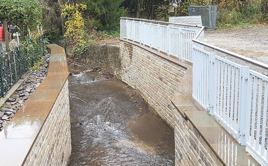 Auch im Buchmühlenpark ist das mit Mitteln der Regionale 2010 neu gestaltete Bachbett jetzt fertig: mit aufwendigen natursteinverkleideten Wänden und einem breiten Weg von der Odenthaler zur Parkpalette sowie einer neuen Fußgängerbrücke.