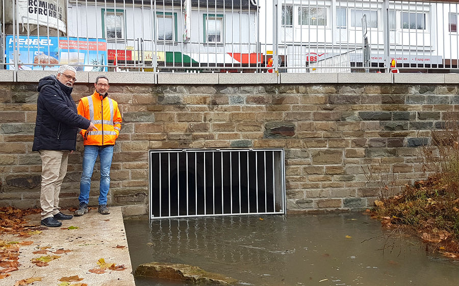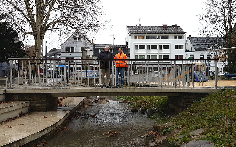 Der Anschluss der Strunde in der Problembaustelle an der Buchmühle / Hauptstraße wurde jetzt wieder hergestellt, die Schleusen geöffnet. Der Bach, der aufgrund der Bauarbeiten einige Wochen komplett in der unterirdischen Röhre verschwunden war, fließt nun wieder oberirdisch durch den Buchmühlenpark, den neuen Forumpark und den kleinen Park hinter der Villa Zanders. Ein Anlass, zu dem Strundeverbandschef Martin Wagner und der für den Wasserbau zuständige Ingenieur Arndt Metzen am Montag eigens  die Medien eingeladen hatten.