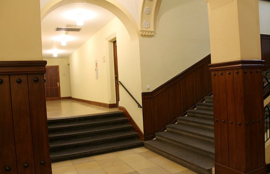 Der Zugang muss von der Rückseite des Gebäudes erfolgen, da auch die Treppe auf der Vorderseite eine Barriere darstellt, die aus Gründen des Denkmalschutzes nicht umgebaut werden kann.