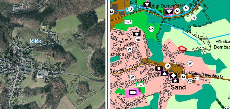 „Die Baufläche liegt nördlich der Bebauung der Herkenrather Straße und nutzt das noch relativ ebene Gelände, das nördlich durch einen bewaldeten und relativ steilen Hang zur Straße Häuser Dombach hin begrenzt wird bestmöglich für eine angemessene Wohnbebauung aus. Westlich grenzt die Bebauung der Dombach-Sander Straße an, östlich orientiert sich die Baufläche am Ende der Bestandsbebauung an der Herkenrather Straße, von wo auch die Erschließung erfolgen kann.”