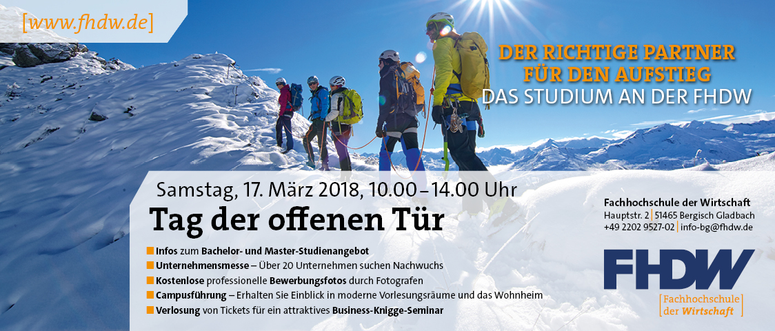 Am Samstag, 17. März, lädt die Fachhochschule der Wirtschaft in Bergisch Gladbach (FHDW) zum Tag der offenen Tür. Von 9.45 bis 14 Uhr informieren Dozenten, Mitarbeiter, Studierende und die Partnerunternehmen der FHDW über die Möglichkeiten der dualen Bachelor-Studiengänge und der berufsbegleitenden Master-Studiengänge.