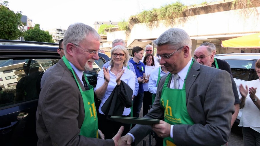 Die positive Lärmkulisse komme im rechten Moment, freut sich Bürgermeister Lutz Urbach und überreicht Georg Daubenbüchel, dem Vorsitzenden der Interessensgemeinschaft Bensberger Handel (IBH) die silberne Ehrennadel der Stadt Bergisch Gladbach. Einstimmig hatte der Rat für diese Ehrung abgestimmt.