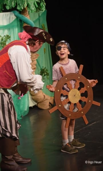 Alle folgten begeistert der Aufführung, zumal die Mannschaft des Käpt’n noch verstärkt wurde durch Kinder aus dem Publikum, die z.B. als “Steuermann”, “Ausguck” oder “Prinzessin” fungierten. Gemeinsam wurde allen Gefahren getrotzt, der Schurke Caracho hereingelegt und die liebliche Prinzessin nach ihrem tragischen Schiffsbruch wieder nach Hause gebracht.