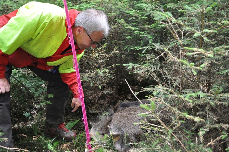 Dazu durchsuchten zwei 20-köpfige Teams, die sich zu Menschenketten formierten, das unwegsame Gelände. Schwerpunkt der Übung war zudem das Bergen von verendeten Wildschweinen.