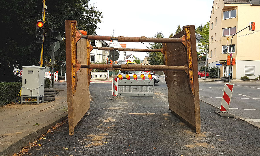 Auf der Hauptverkehrsader im Osten der Stadt wir seit Beginn der Sommerferien noch einmal gearbeitet: bei der Verlegung der neuen Rohre für den Hebborner Bach war hier im Vorjahr unter der Erde eine Lücke geblieben, aufgrund eines Rechtsstreits mit einem Anwohner. Eine Baustellenampel regelt den Verkehr zwischen der Kreuzung am Broich und Mühlenberg, was selbst in den Ferien immer wieder zu langen Rückstaus führt.