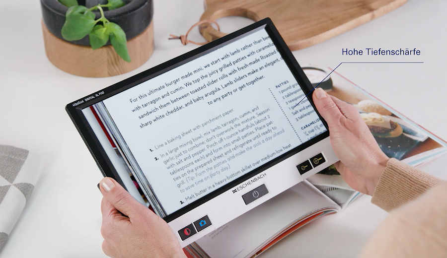 Mit bis zu 22-facher Vergrößerung lassen sich auf dem reflexionsfreien Display selbst kleinste Details hervorragend erkennen. Die HD-Kamera sorgt für eine helle, kontraststarke und detailgetreue Abbildung, die großen Sehfelder ermöglichen das bequeme Lesen einer ganzen Zeitungsspalte.