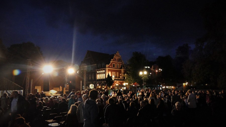 Ab 18 Uhr trudelten SängerInnen, Orchestermitglieder und erste Gäste ein, über den Platzen wehten Einsingübungen und Anspielproben, später bildete sich eine Einlass-Schlange von Höhe der Fußgängerzone bis zum Hauptportal von St. Laurentius und in dem abgezäunten Gelände waren nur noch auf der Rathausseite einzelne Sitzplätze frei.