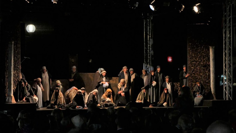 Das Publikum – teilweise ausgestattet mit Sitzkissen und Decken – wurde nun mitgenommen in das vielschichtige Libretto über das Streben des jüdischen Volkes nach Freiheit aus der babylonischen Gefangenschaft, den durch Selbstüberschätzung in den Wahnsinn geglittenen Titelhelden Nebukadnezar, die intrigante und machthungrige Abigaille, die Liebesgeschichte in der Gefangenschaft zwischen Ismaele und Fenena, schlussendlich die göttliche Rettung.