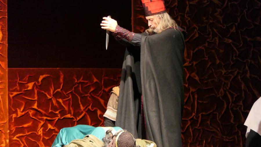 Eine Freilichtwanderbühne hat nur begrenzte Möglichkeiten bei der Menge der Requisiten und den Kulissen – entsprechend zurückgenommen wurde dies gelöst mit universell einsetzbaren „Steinblöcken“, verschiebbaren Hintergrundelementen und einem hart umkämpften Königsthron.