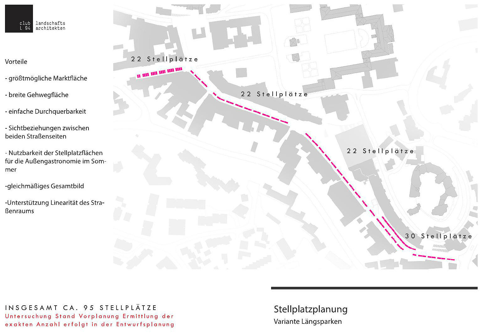 Wenn ich also weiß, dass bei möglicher schräg Anordnung der Fahrzeuge 25 % mehr Platzbedarf erforderlich ist für nur 10 zusätzliche Parkplätze bei den Stellmöglichkeiten, dann ist eben abzuwägen, ob das für alle Akteure, auch die flanierenden Besucher in einem zumutbaren Verhältnis steht zum Gesamtnutzen. Die zusätzlich entstehenden Einschränkungen wie Sichtbehinderung, Autobarriere beim queren der Straße, Verengung der Durchfahrt etc. sind bekannt. Zumal man sich weiter und weiter vom Siegerentwurf entfernt, den eigentlich alle gut finden.