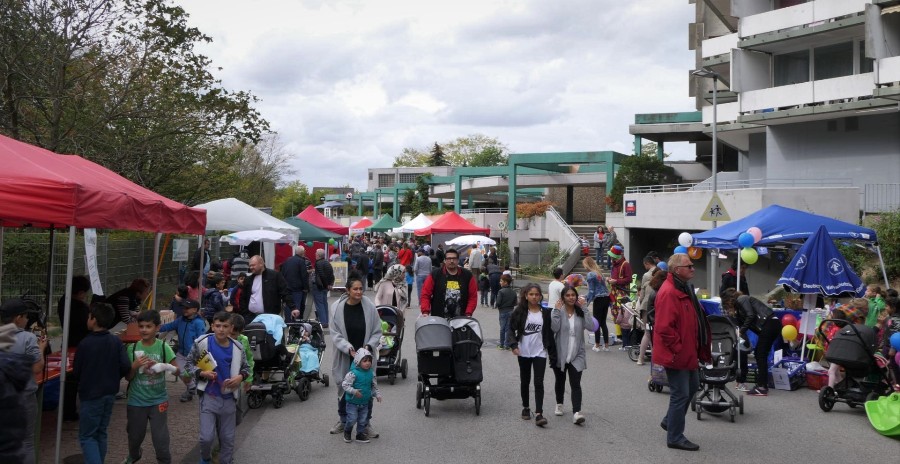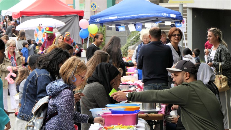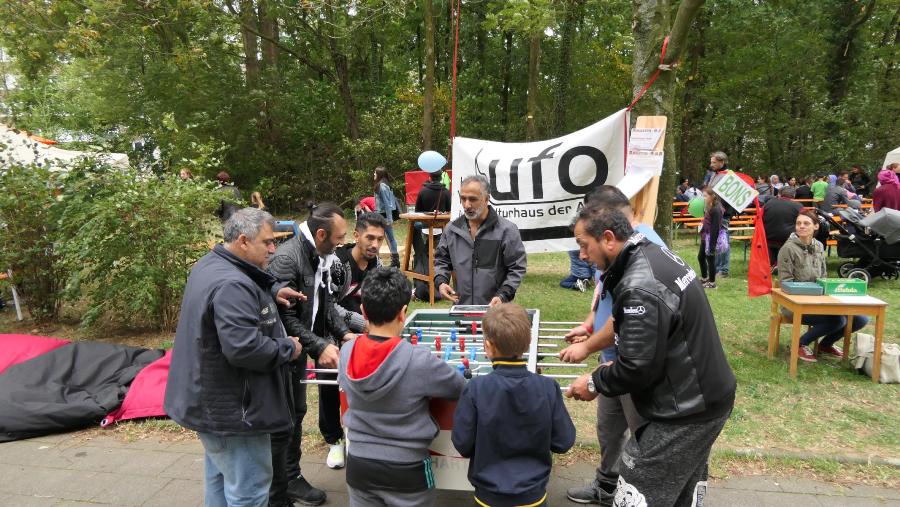 Eine bunte Bühne, farbenfrohe Auftritte, Spielbereiche und ein internationales Buffet begleiteten das Fest. Die Männer lockte der Tischfußball, die Frauen der gemeinsame Gedankenaustausch und die Kinder bevorzugten Karussell, Tanz, Experiment, Clown und  Seifenblasen-Künstler.