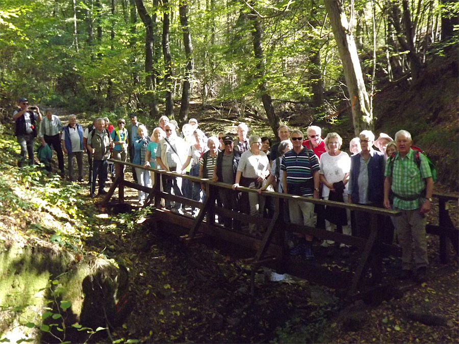 Bis die Wandergruppe jedoch von Kalenborn nach Kasbach aufbrach, war zunächst ein kleiner Imbiss angesagt, der von Vroni und Nobbi genüsslich und süffisant vorbereitet war. Wohl gestärkt machte sich die Gruppe nun auf Schusters Rappen auf den Weg vom Bahnhof Kalenborn auf einer stetig bergab führenden ca. 6,5 km langen schönen Wanderroute durch das malerische Kasbachtal mit seinen urwüchsigen Wäldern an steilen Hängen und schroffen Basaltsteinbrüchen. Der romantische Wanderweg kreuzt mehrfach mittels Unterführungen die Bahnstrecke und hat dabei den hinplätschernden Kasbach als ständigen Begleiter.