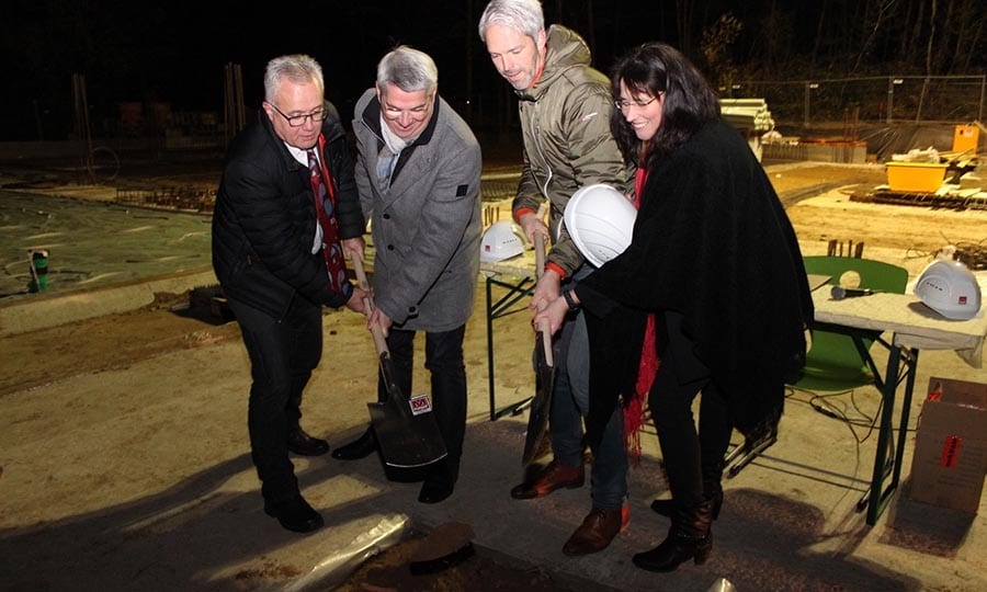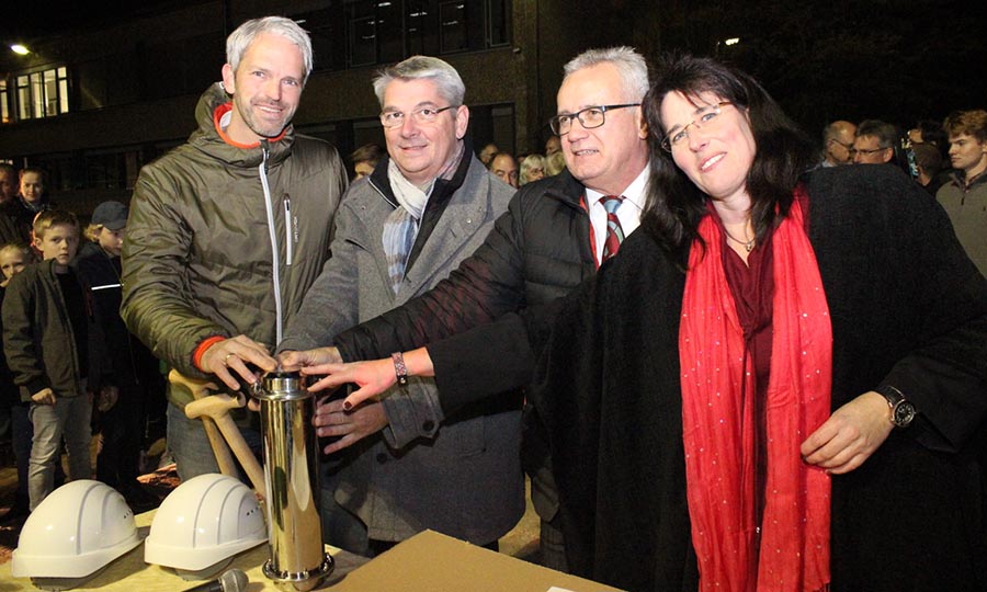 Und während die Hauptakteure symbolisch Erde auf die Zeitkapsel schippen, erläutert Urbach den Mehrwert der neuen Halle: „Für die Vereine in der Umgebung ist die Turnhalle ein zusätzlicher Gewinn. Nach dem Schulbetrieb könnten sie die Halle mitnutzen und ihr Programm erweitern.“