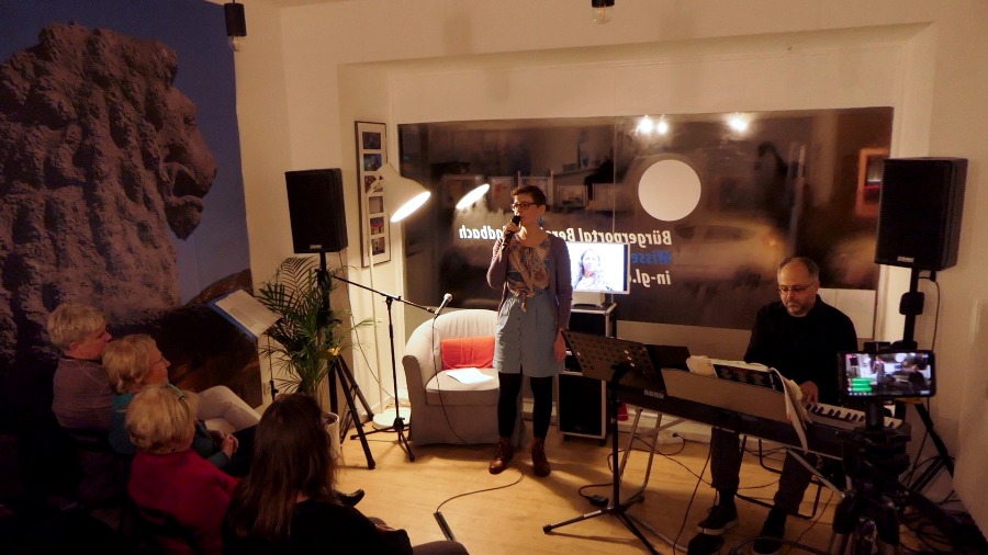 Nach der Lesung gaben Holger Crump am Piano und Sängerin Yvonne Stricker ein kleines Konzert mit brasilianischem Bossa Nova. Laura Geyer sang auch selbst, in der Lesung und zum Abschluss des Abends.