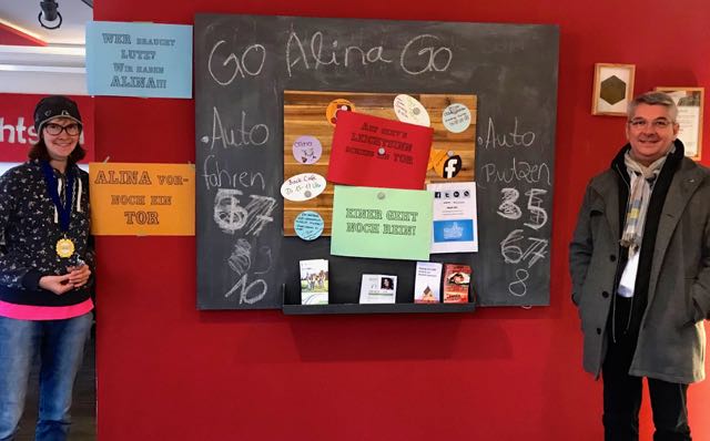 Alina Junghans arbeitet im Cafe Leichtsinn und ist immer wieder für originelle Einfälle gut. So hatte sie Bürgermeister Lutz Urbach zum Duell am Kicker herausgefordert. Der verlor prompt – und muss jetzt für seinen Wetteinsatz gerade stehen.