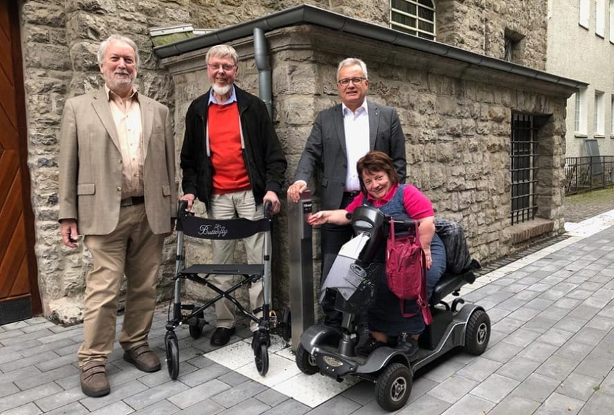 Eine neu angelegte Tür auf der Rückseite des Rathauses kann von außen und innen per Knopfdruck geöffnet werden. „Die Kosten für den Umbau des Platzes neben dem Rathaus belaufen sich auf circa 130.000 Euro“, gibt Co-Dezernent Bernd Martmann an. Etwa 40 Prozent der Summe ist in den Umbau des barrierearmen Weges zur Rückseite des Rathauses geflossen, ohne den der Platz nicht umgebaut worden wäre.