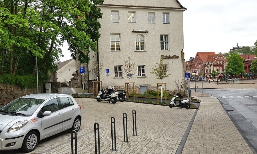 Der neue Weg verläuft zwischen Parkplatz und Rathaus bis zur Tür auf der Rückseite des Gebäudes.