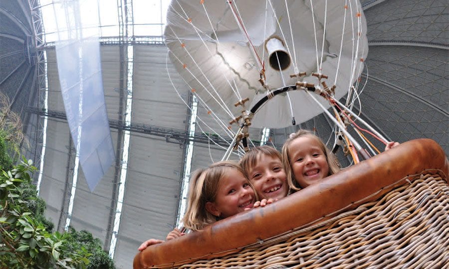 Ein großer Helium-Ballon erwartet die Kleinen mitten im Shopping Center. Sie steigen in den Korb ein, wie richtige Heißluftballon-Fahrer. Dort werden sie sicher angeschnallt, und dann heben sie ab: Hoch und immer höher steigen die kleinen PilotInnen, bis unter die 28 Meter hohe Decke der Galerie.