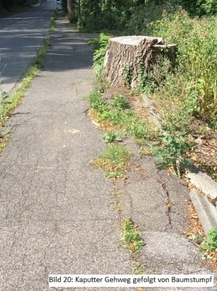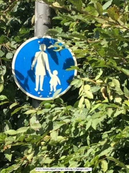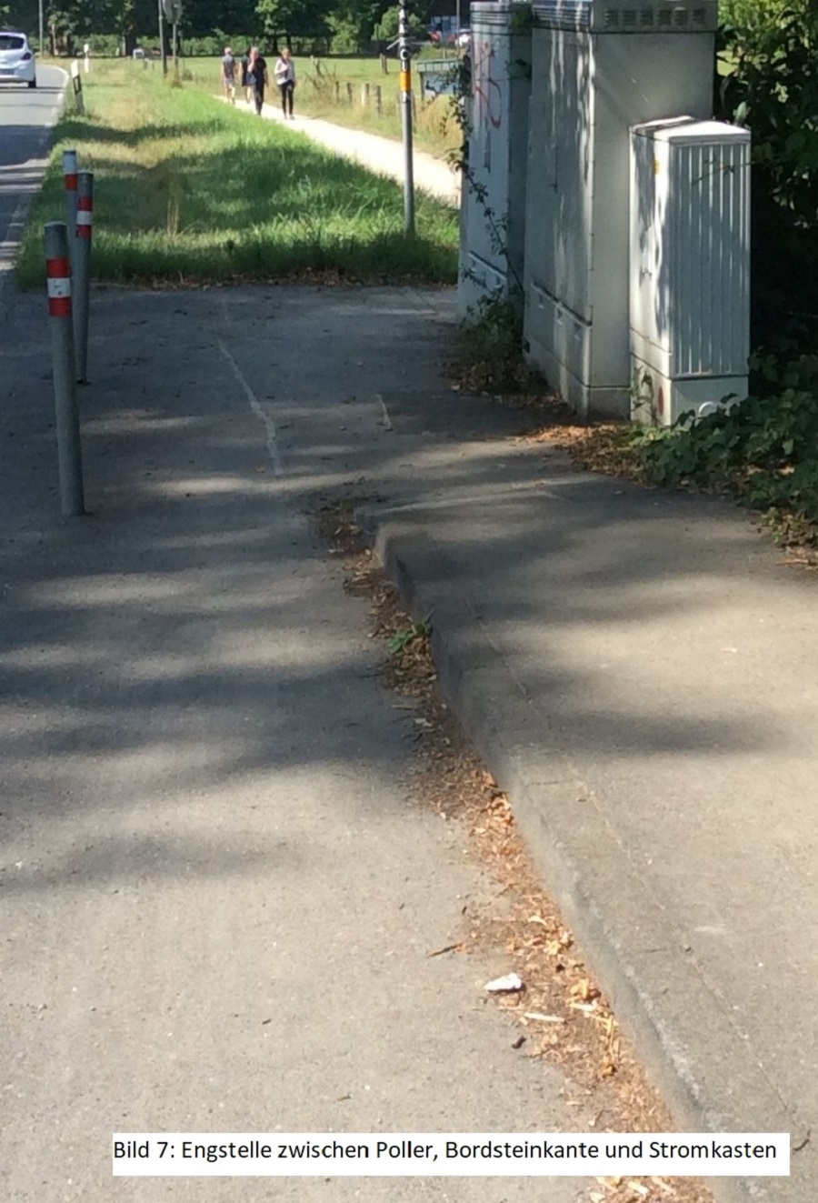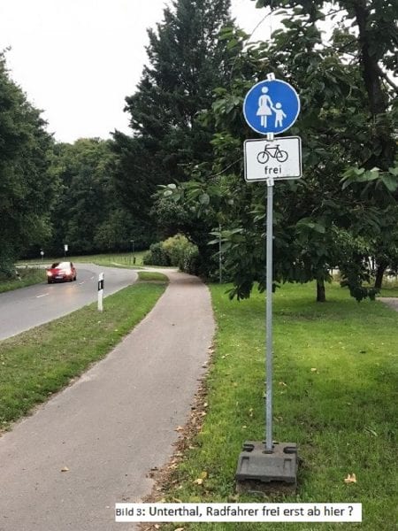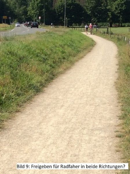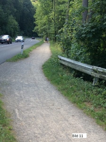 Siehe Artikel, Bild 10. An dieser Stelle müsste man “rausgucken”, ob Autos mit 70 km/h aus der Kurve kommen und schnell sich entscheiden, ob man gerade jetzt die Strasse mit Kind und Fahrrad überqueren kann. Unzumutbar!