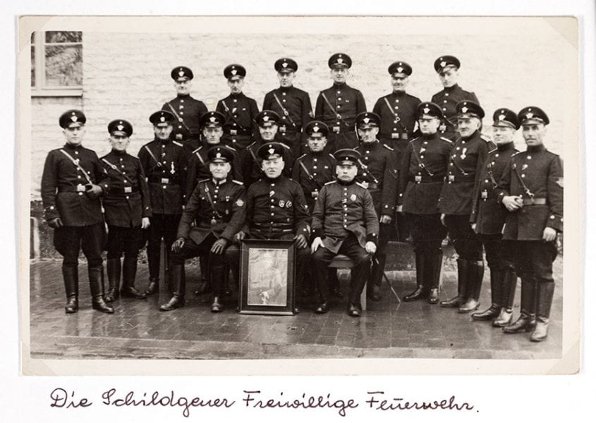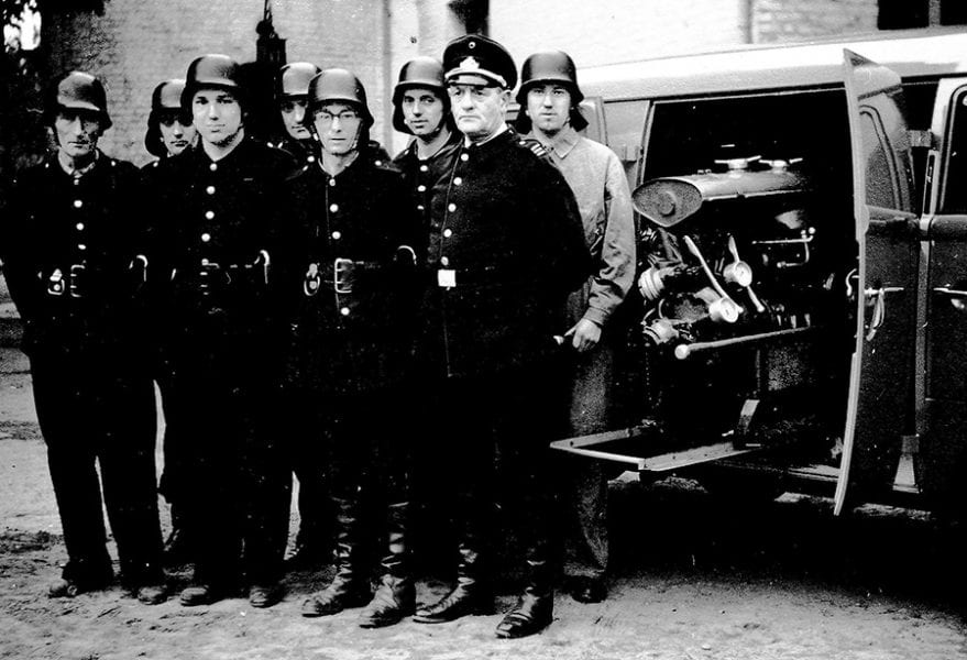 Die Löschgruppe Mitte der 1930er-Jahre. In der Nazi-Zeit hieß die Feuerwehr „Feuerschutzpolizei“, auf der Uniform war ein Reichsadler mit Hakenkreuz abgebildet.