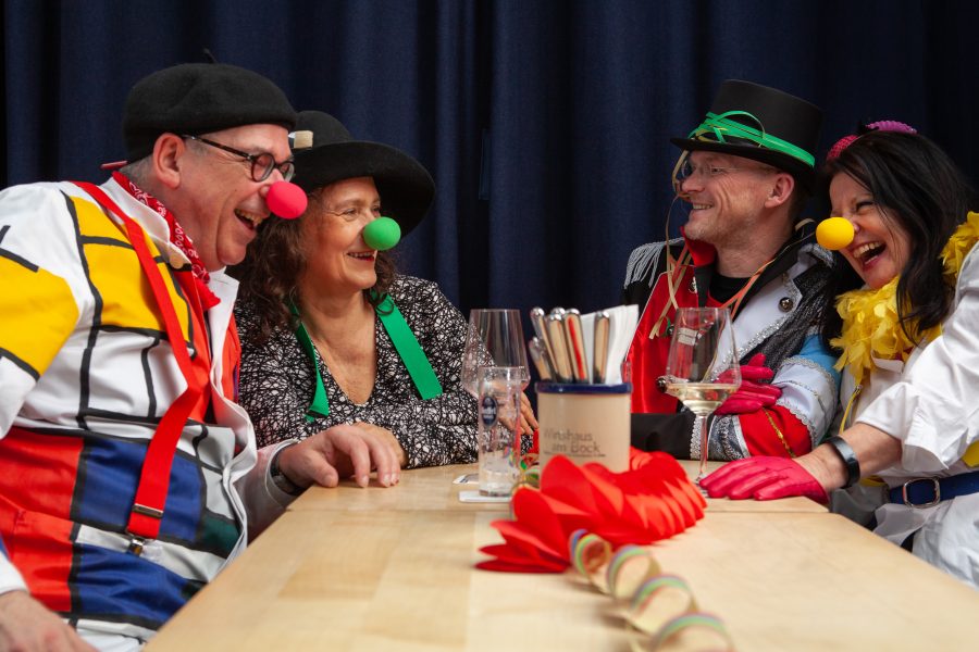 Bürgermeisterkandidat Frank Stein und das Parteienbündnis aus Grünen, FDP und SPD demonstrieren Zusammenhalt – im Karnevalskostüm und mit bunten Pappnasen.