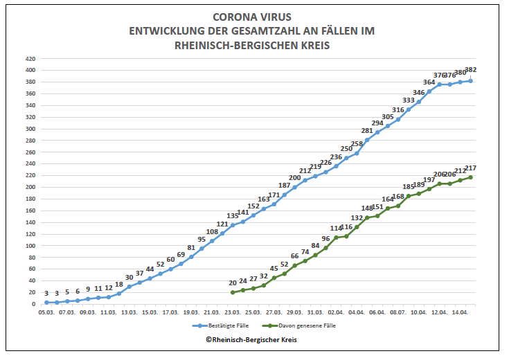 Nachdem am Montag keine neuen Fälle und am Dienstag lediglich drei weitere Infektionen gemeldet wurde blieb diese Zahl auch am Mittwoch mit zwei bestätigten Corona-Erkrankungen niedrig. Damit stieg die Gesamtzahl der im Rheinisch-Bergischen Kreis positiv getesteten Personen auf 382 an.