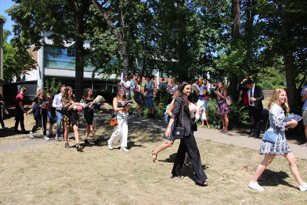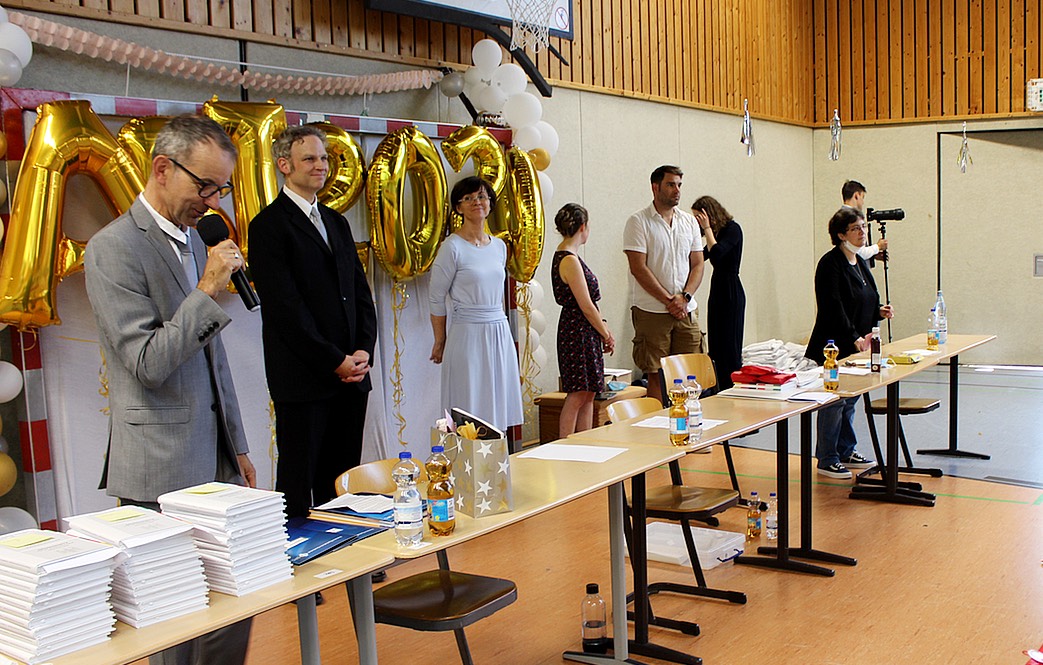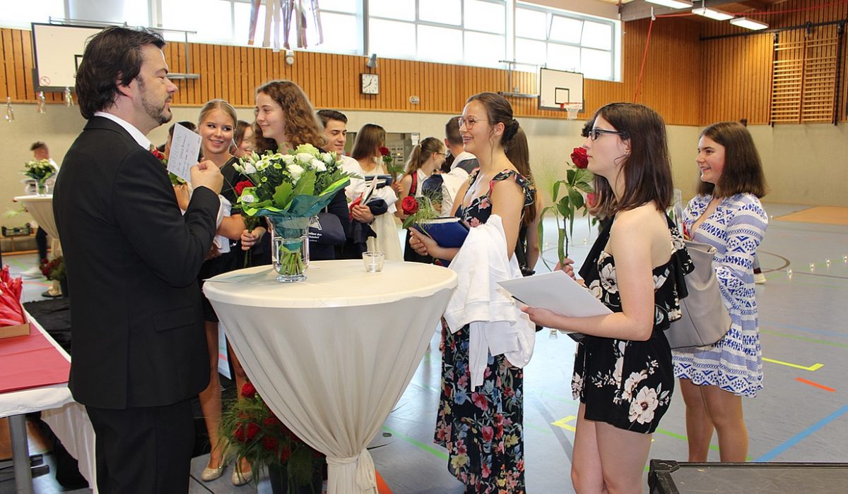 Angesichts dieser Situation hat sich dann die Mehrheit der Schülerinnen und Schüler – sicherlich schweren Herzens – dafür ausgesprochen, dass die Übergabe der Zeugnisse nur im Schülerkreis stattfinden sollte. Aber so konnte die Übergabe der Zeugnisse mit etwas weniger Zeitdruck in drei Durchgängen vonstatten gehen.