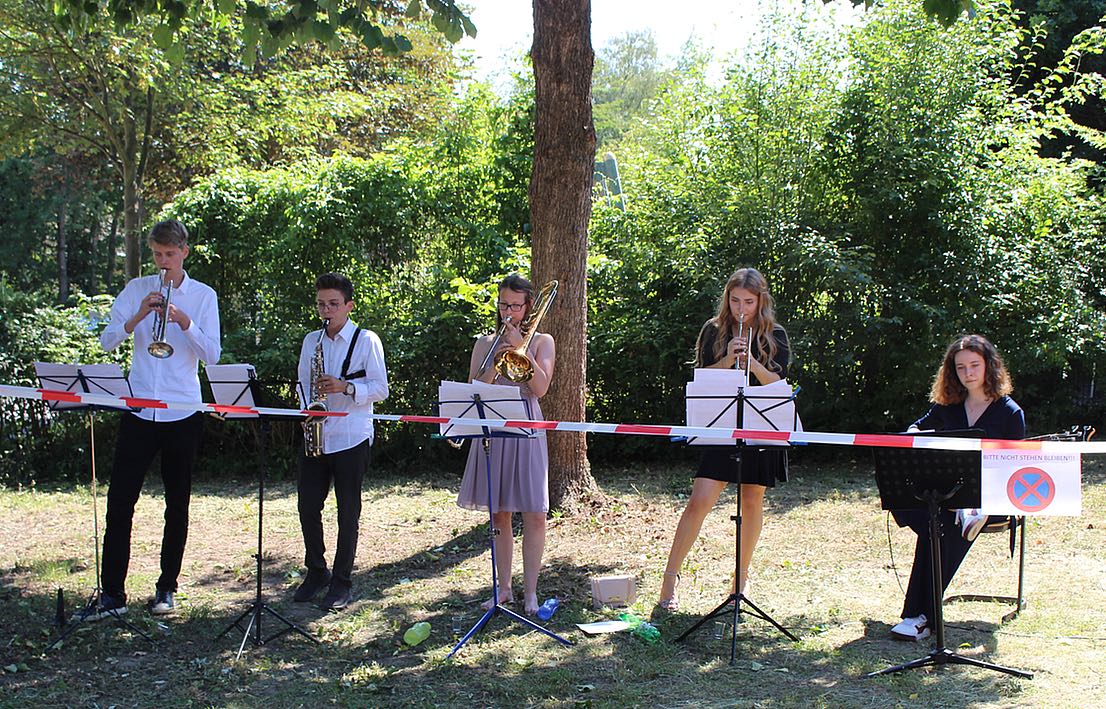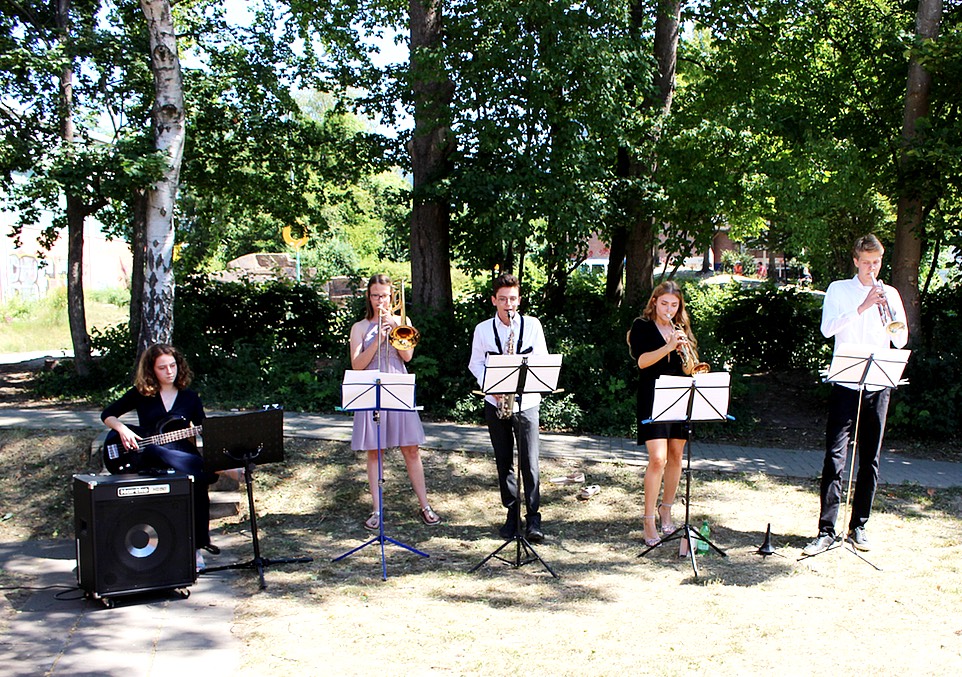 Als besonderes Highlight fand sich dann noch kurzfristig ein kleines Jazz-Emsemble aus dem Abiturjahrgang zusammen, das vor der Sporthalle die jeweiligen Kurse mit Stücken wie “Fever” und “Tequila” empfing bzw. verabschiedete.