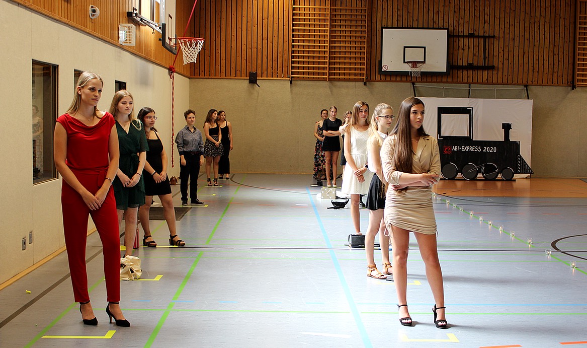 Also galt es, mit dem Zollstock die Sporthalle zu vermessen, um feststellen zu können, wie viele Personen die Halle angesichts der geltenden Hygiene- und Abstandsregelungen überhaupt aufzunehmen vermag. Das Ergebnis nach mehrmaligen Abmessen durch Herrn Schmitter und die beiden Hausmeister war ernüchternd, denn Platz war nur für 36 Schülerinnen und Schüler sowie knapp 10 Lehrkräfte.