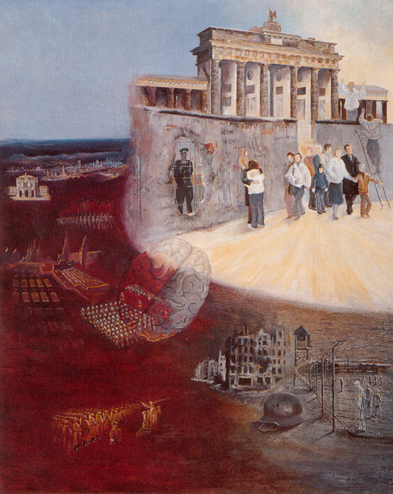 Die Menschen, die ein Leben lang von außen reguliert und konditioniert wurden, verlassen den Osten wie die Menschen, die aus Platos Höhle entsteigen – unsicher, noch nicht fähig, zu sehen. Im Zentrum des Bildes ein menschliches Gehirn mit verschiedenen Lichtschattierungen, Helligkeit neben Dunkel.
