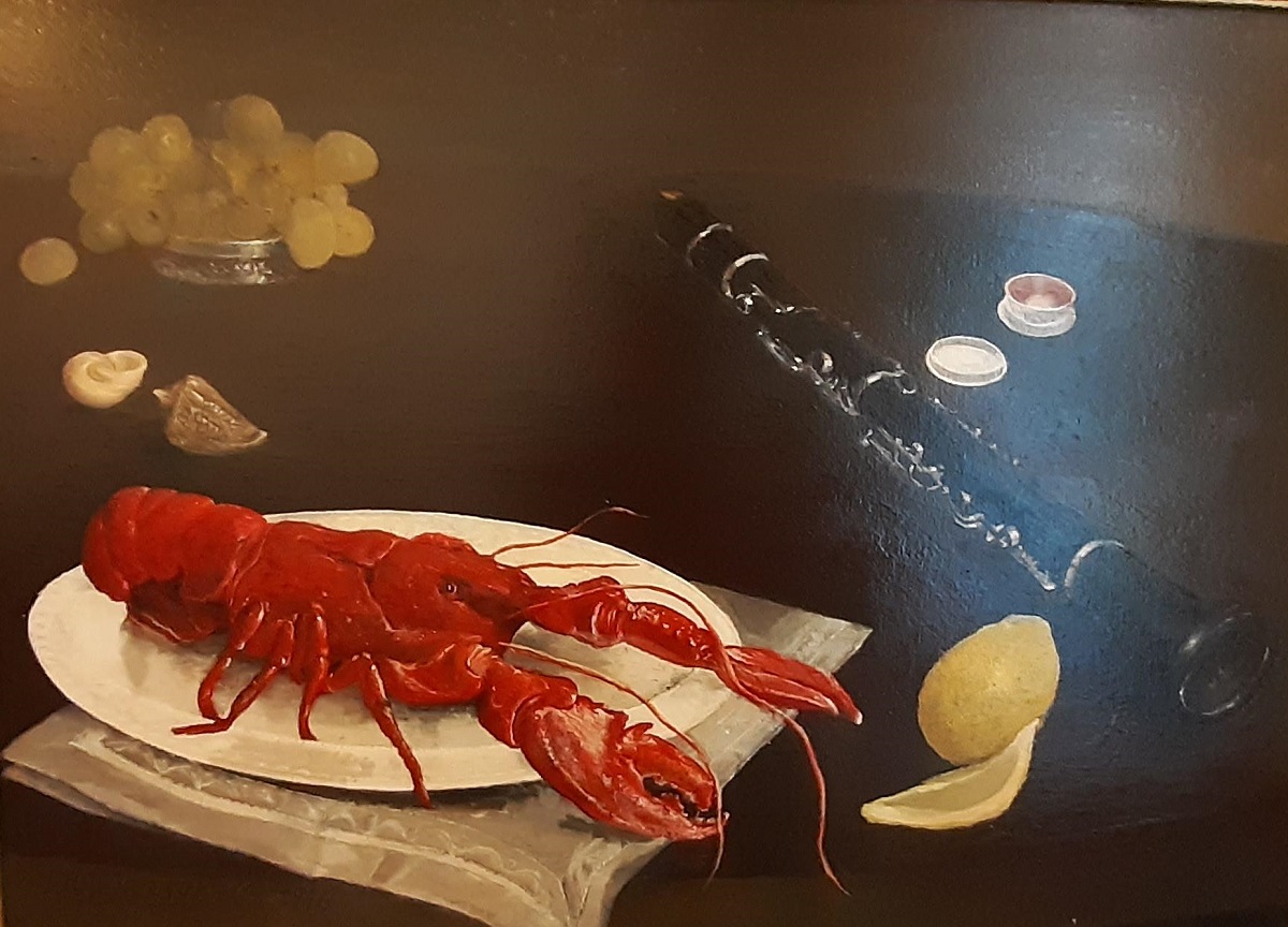 Im Gegensatz dazu stehen die gezeigten Ölgemälde. Hierunter fällt zum Beispiel das Werk “Mauerfall”, das die Deutsch-Deutsche Geschichte 1989 sehr assoziativ illustriert. “Heinrich Jarczyk stammt aus dem Osten (Anm. der Red.: geboren in Neisse, Schlesien), insofern liegt die Vermutung nahe dass er dieses Ereignis weitaus emotionaler wahrgenommen hat als dies vielleicht für Künstler aus dem Westen der Fall war”, erläutert Petra Oelschlägel. Wundervoll auch das Stilleben “Hummer”, das Lieblingsbild von Jarczyks Frau, die selbst Klarinette spielen soll, verrät Petra Oelschlägel.