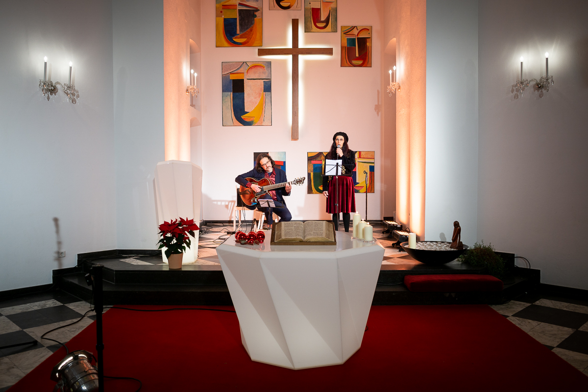 In der Gnadenkirche hat Pfarrer Thomas Werner alle Präsenzgottesdienste abgesagt, statt dessen hat der KulturKurier die Heiligabend-Andacht ohne Publikum live übertragen. Gleichzeitig wurde sie über Lautsprecher vom Dach des EVK in die ganze Stadt ausgestrahlt. Es singen und spielen Martina Gassmann und Frank Wingold.