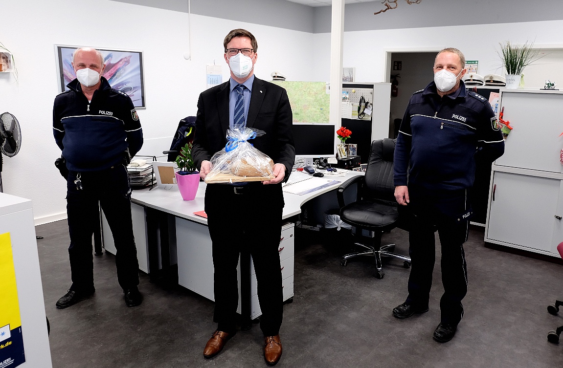 Nun hat Landrat Stephan Santelmann die Bensberger Bezirksdienstbeamten in ihrem neuen Büro begrüßt, nach alter Sitte mit Salz und einen Laib Brot.
