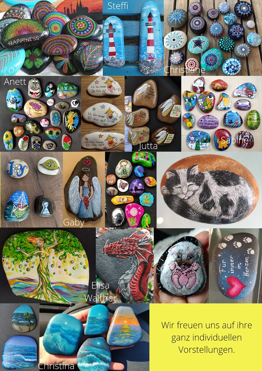 Ein mittlerweile recht großer Kreis an künstlerisch begabten Freundinnen bemalt Steine, die von Interessenten gegen eine individuelle Spende mitgenommen werden. Auch Wunschmotive sind möglich. Steine und Infos gibt es derzeit im Edeka in Sand, im Unverpackt-Laden “Büggel” liegen zudem Flyer aus.