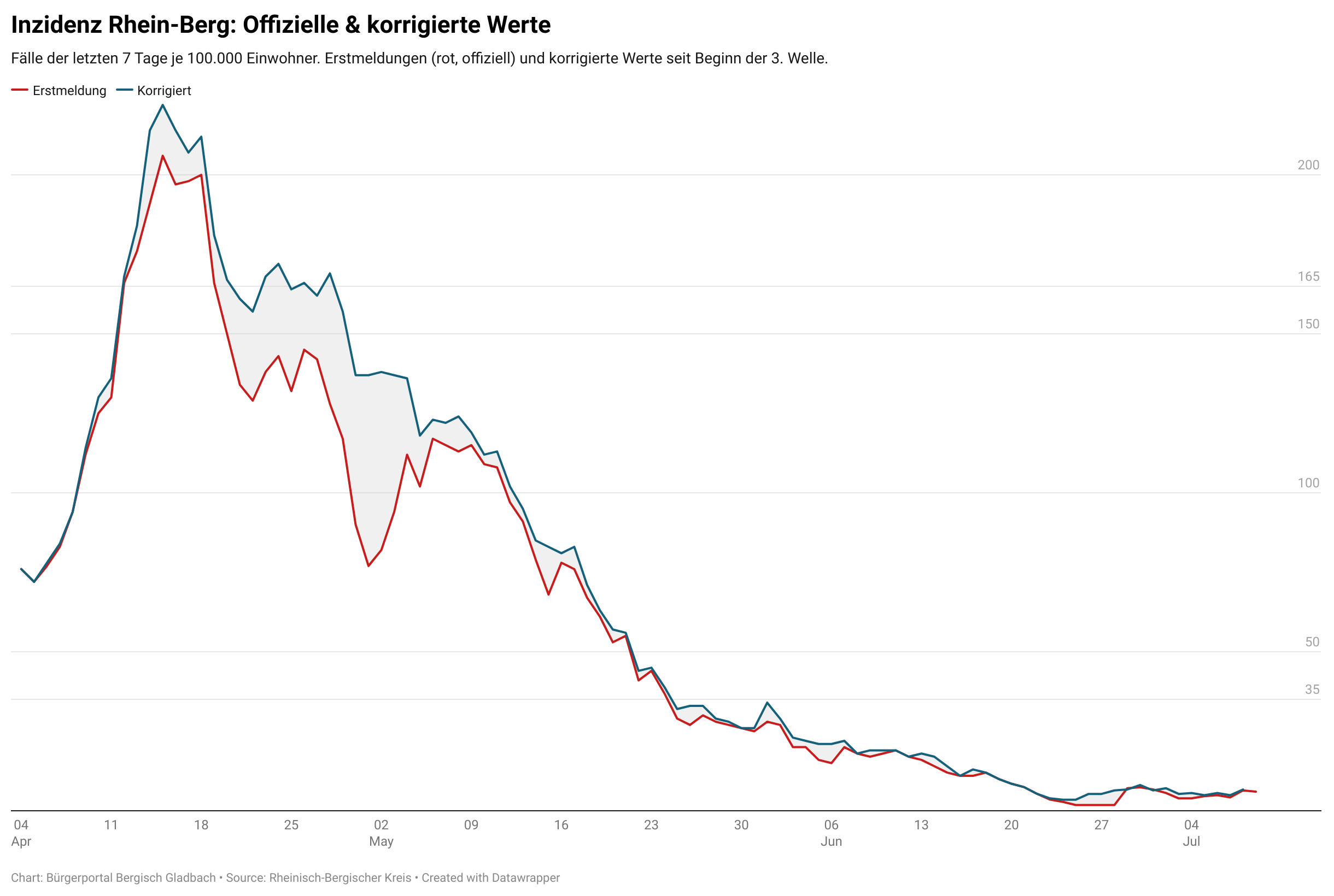 Der Inzidenzwert für den Vortag wurde deutlich nach oben korrigiert, die reale Inzidenz lag am Vortag bei 9,9. Die Tage davor blieben unverändert (siehe Grafik ganz oben).