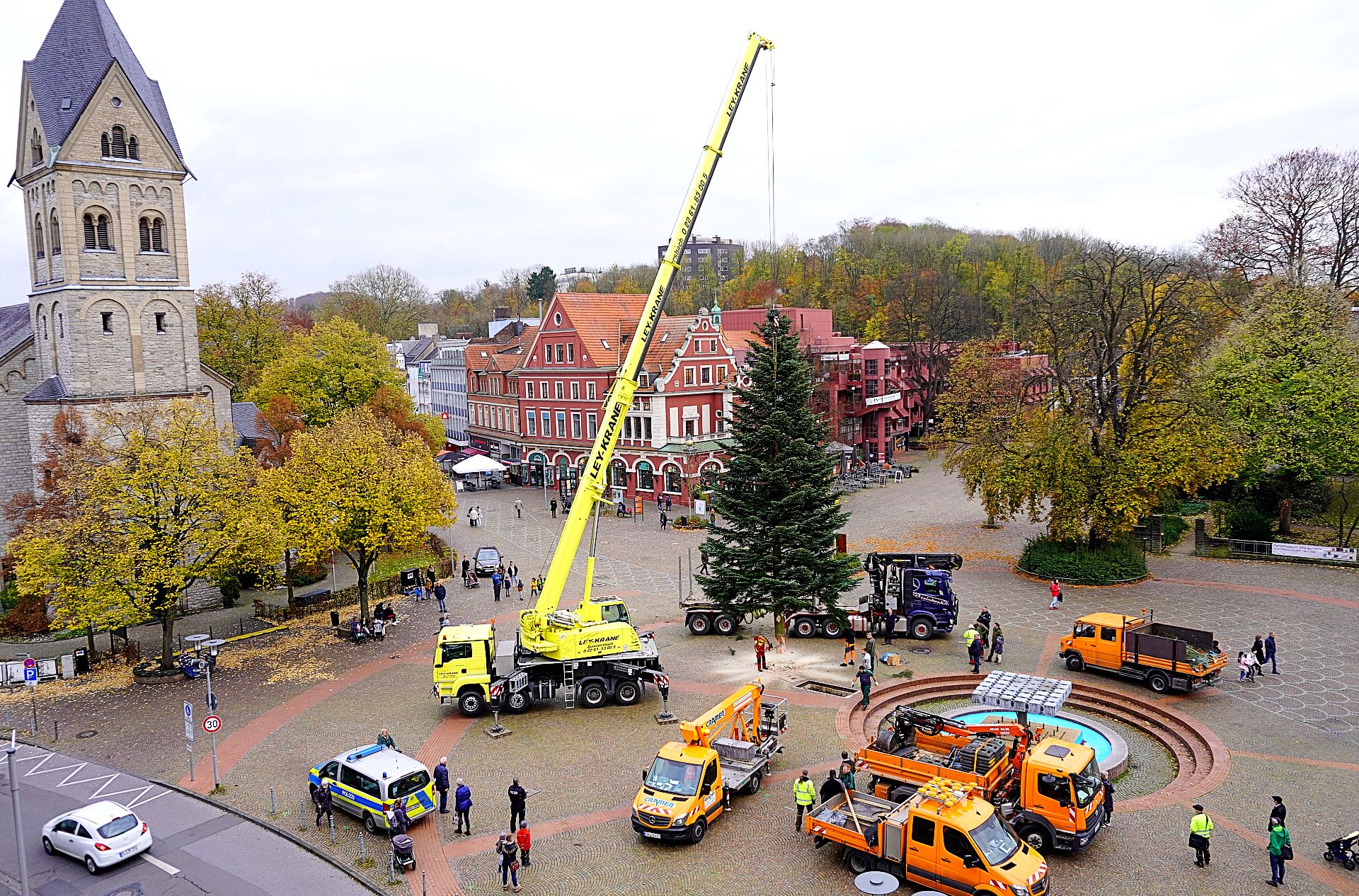 Auf dem Konrad-Adenauer-Platz kommen die Lichter und Kugeln in den nächsten Tagen in die Zweige. Hier beauftragt die städtische Wirtschaftsförderung traditionell das Anbringen des Schmucks. Erst danach können rundherum Buden, Bühne und Tische für den Weihnachtsmarkt platziert werden, der am Donnerstag, dem 18. November eröffnet.