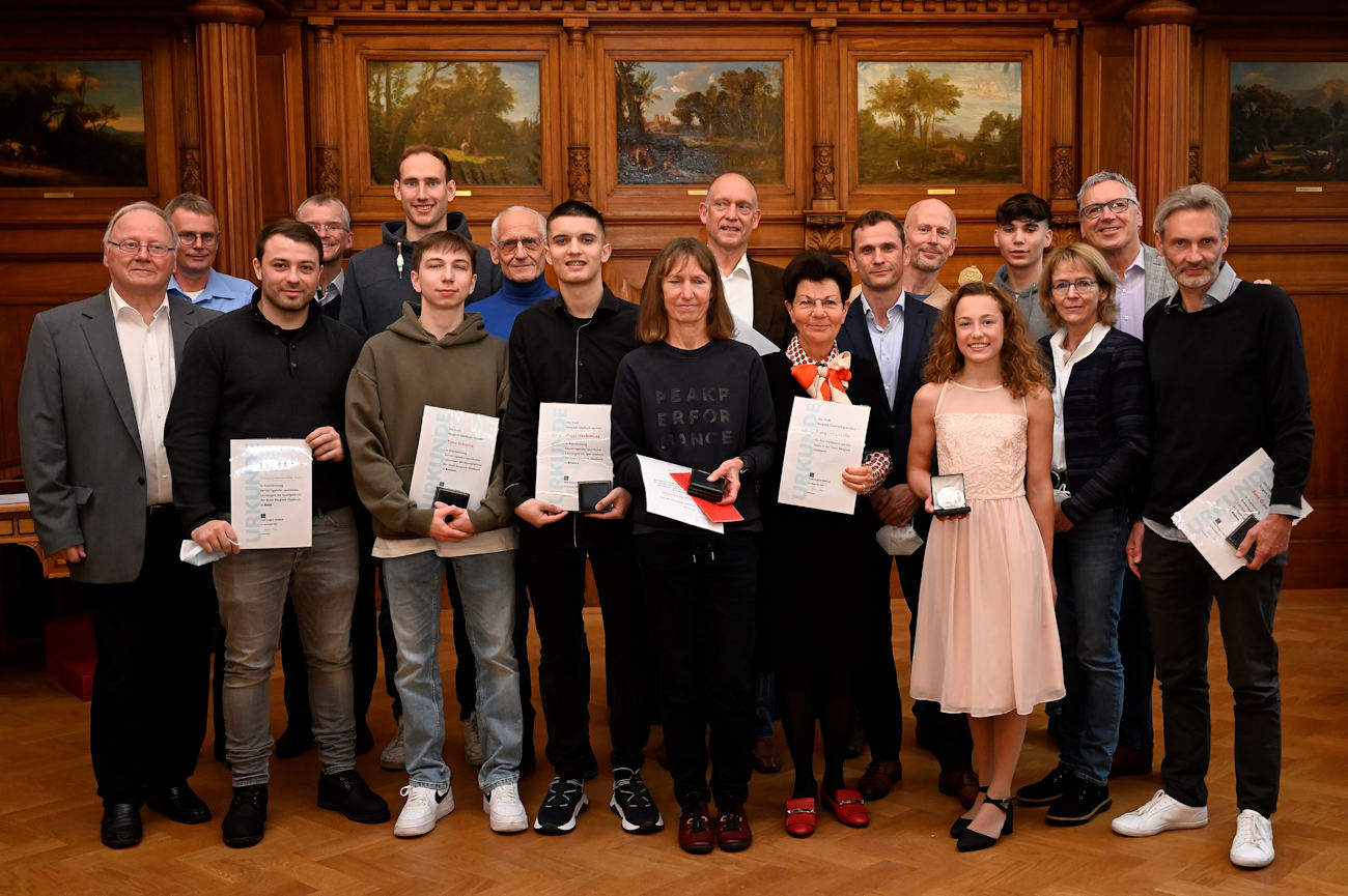 Am Samstag fand die Feierstunde für Sportler:innen im Großen Ratssaal des historischen Rathauses statt. Bürgermeister Frank Stein und der Stadtsportverband ehrten erfolgreiche Sportler der Stadt für herausragende Leistungen in 2019 und 2020 mit der Sportplakette.