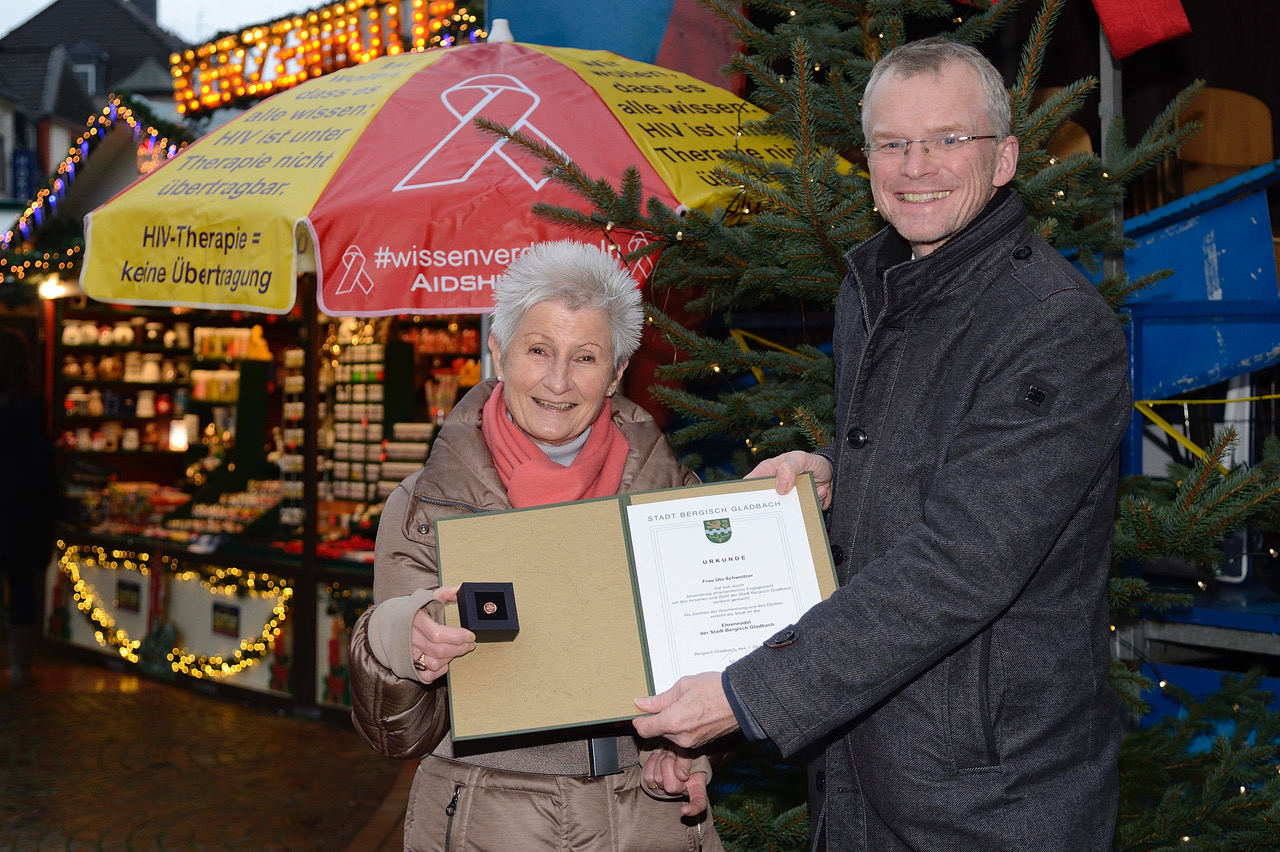 Zum Welt-Aids-Tag erhielt Uta Schweitzer die Ehrennadel der Stadt Bergisch Gladbach aus den Händen des Bürgermeisters. Sie wurde auf dem Weihnachtsmarkt für ihre unermüdliches ehrenamtliches Engagements bei der Bergisch Gladbacher AIDS-Hilfe ausgezeichnet.