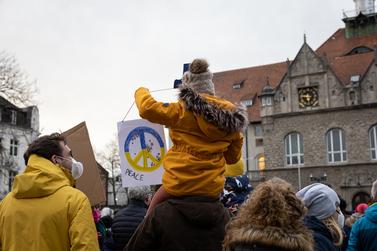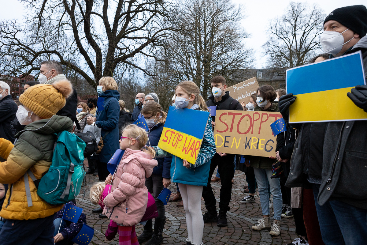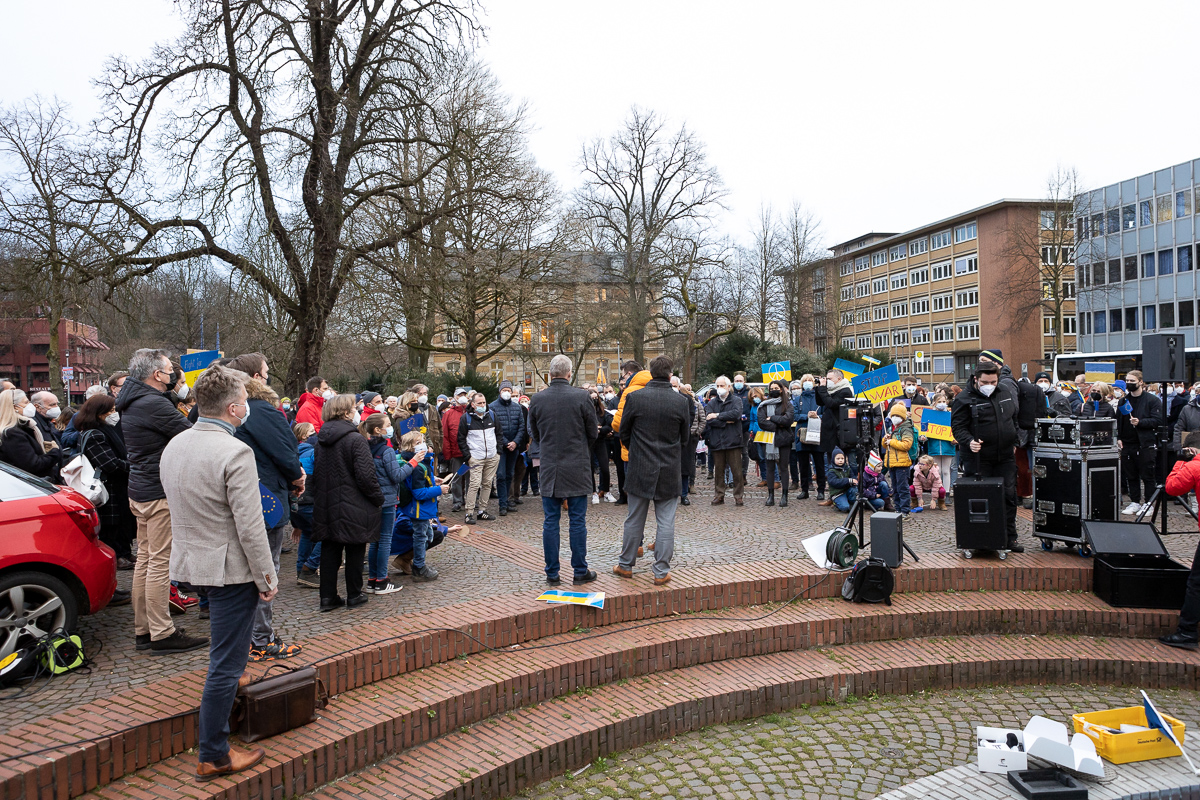 Rund 300 Menschen, Kinder und junge Schüler:innen, viele Jugendliche und Erwachsene jeder Altersgruppe sind dem Aufruf von Junger Union, Jungen Liberalen, Jusos und Grüner Jugend gefolgt, bei dieser überparteilichen Mahnwache Stellung zu beziehen. Viele tragen blau und/oder gelbe Kleidungsstücke, vor allem die Jüngeren haben Protestplakate mitgebracht.