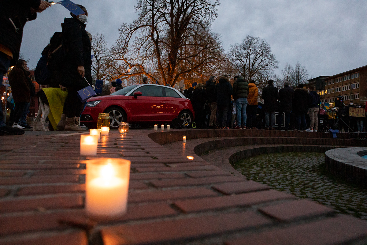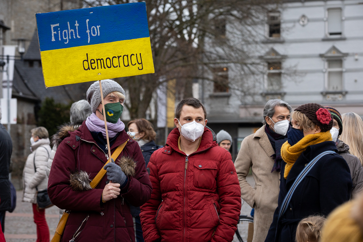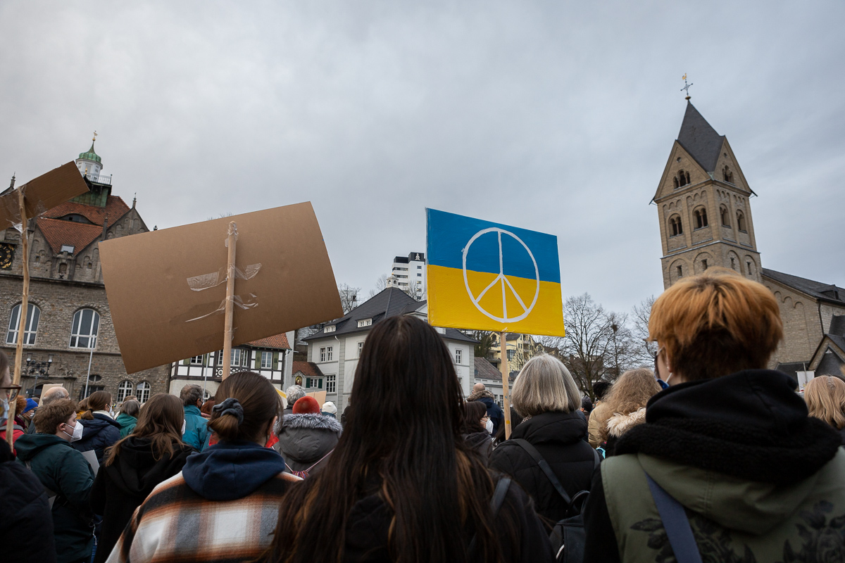 „Ich hätte niemals gedacht, dass …”. Dieser Satz kommt in den Ansprachen von Bürgermeister Frank Stein, Landrat Stephan Santelmann und Kreisdechant Norbert Hörter bei der Ukraine-Kundgebung am Dienstagabend immer wieder hoch. Auch am sechsten Tag des russischen Kriegs gegen das Nachbarland können auch sie einfach nicht fassen, wie diese Katastrophe im modernen Europa passieren konnte. Ebenso einig sind sie sich in ihrer harten Verurteilung des Aggressors Putin – und ihrer Hoffnung, die auf die neue Geschlossenheit der demokratischen Welt gründet.