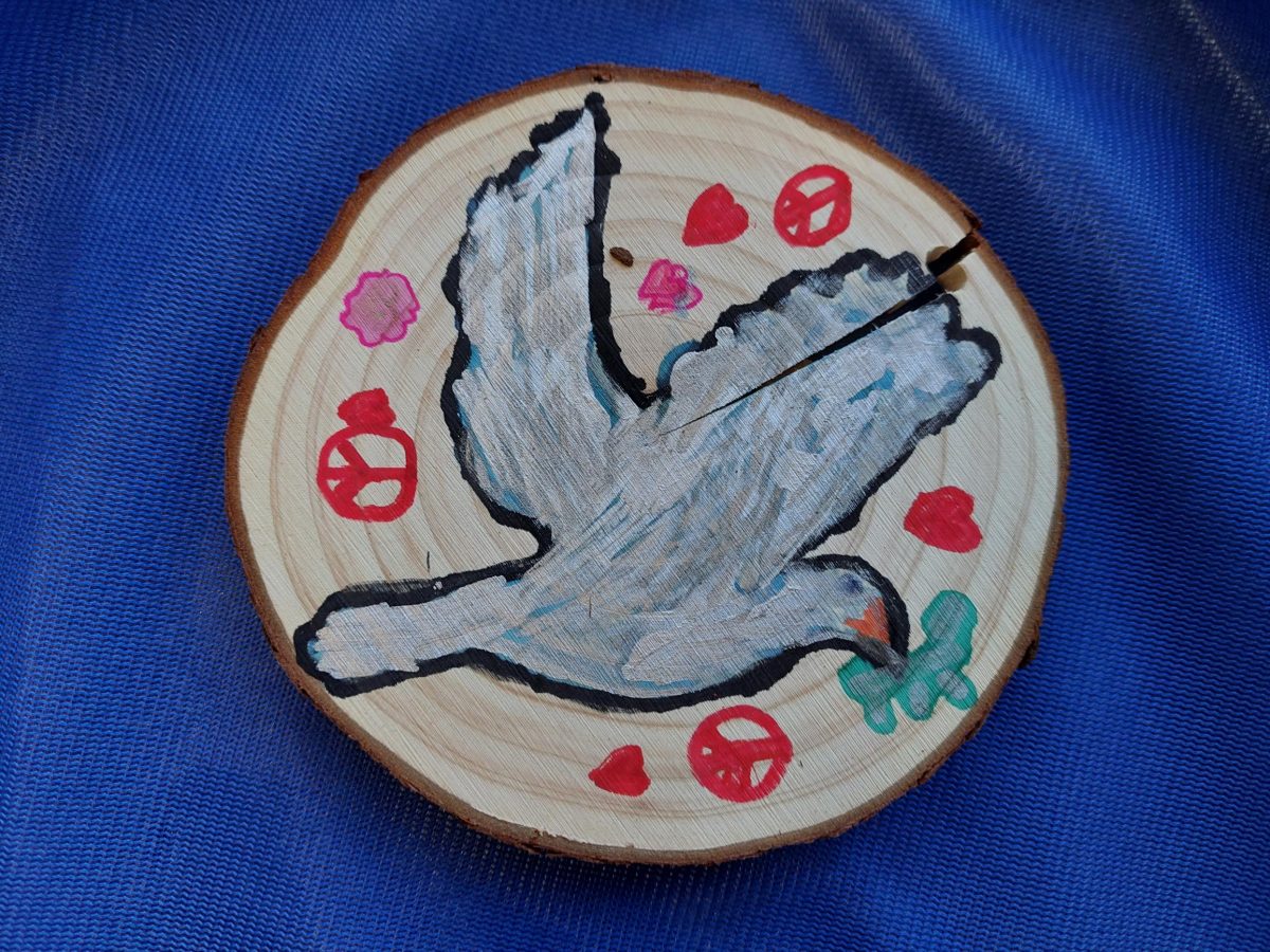 Andere Kinder bemalten Baumscheiben mit der Taube, gestalteten Schmuck und Kerzen. Viele der Tauben zieren – weiß auf blau – auch die Sprossenfenster der KGS Frankenforst, die in der alten Belgischen Schule des Viertels untergebracht ist.