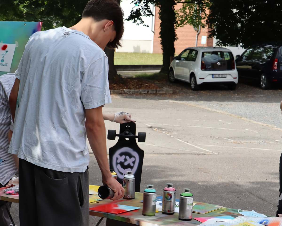 Für die Aktion lieferte das Atelier KLKS Schablonen mit Statements wie „Stop Racism“ und „Democracy for all“, die die Jugendlichen für ihre kreativen Werke verwenden konnten. Auch konnten sie ihre eigenen Ideen einbringen. Kurzerhand wurde auch mal ein Skateboard mit den strahlenden Farben besprüht. Zum Abschluss des Workshops gestalteten die Jugendlichen miteinander ein Bild mit vielen bunten Graffitis zum Thema Demokratie.